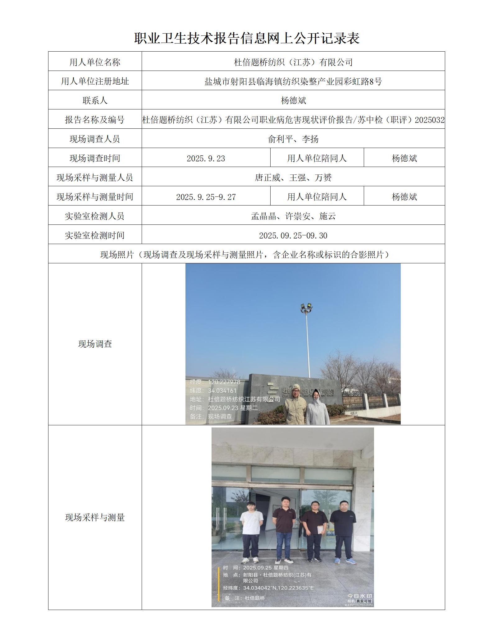 杜倍题桥纺织(江苏)有限公司职业卫生技术报告信息网上公开记录表