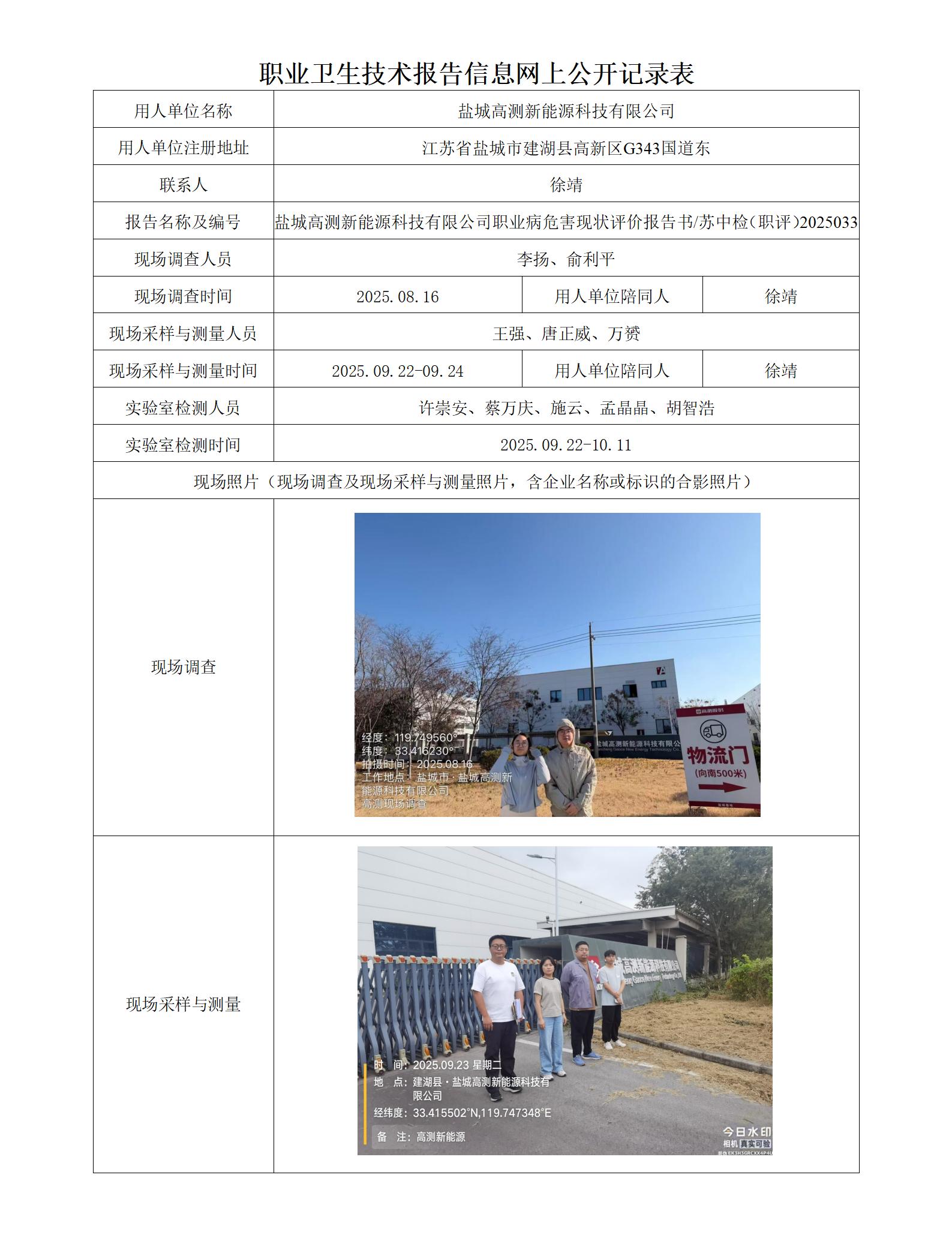 盐城高测新能源科技有限公司职业卫生技术报告信息网上公开记录表