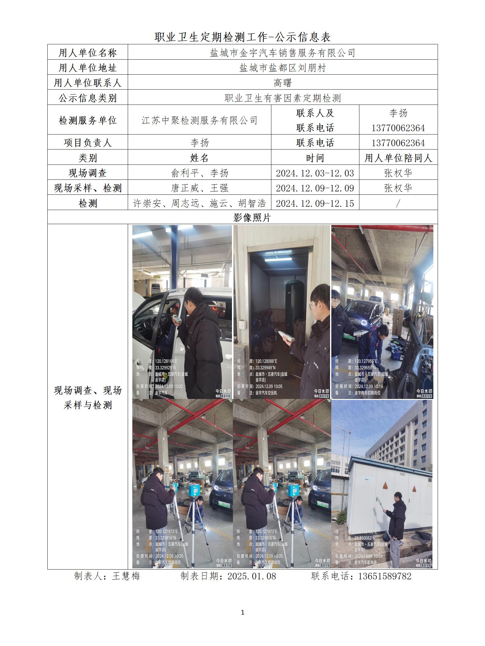 盐城市金宇汽车销售服务有限公司职业卫生定期检测工作公示