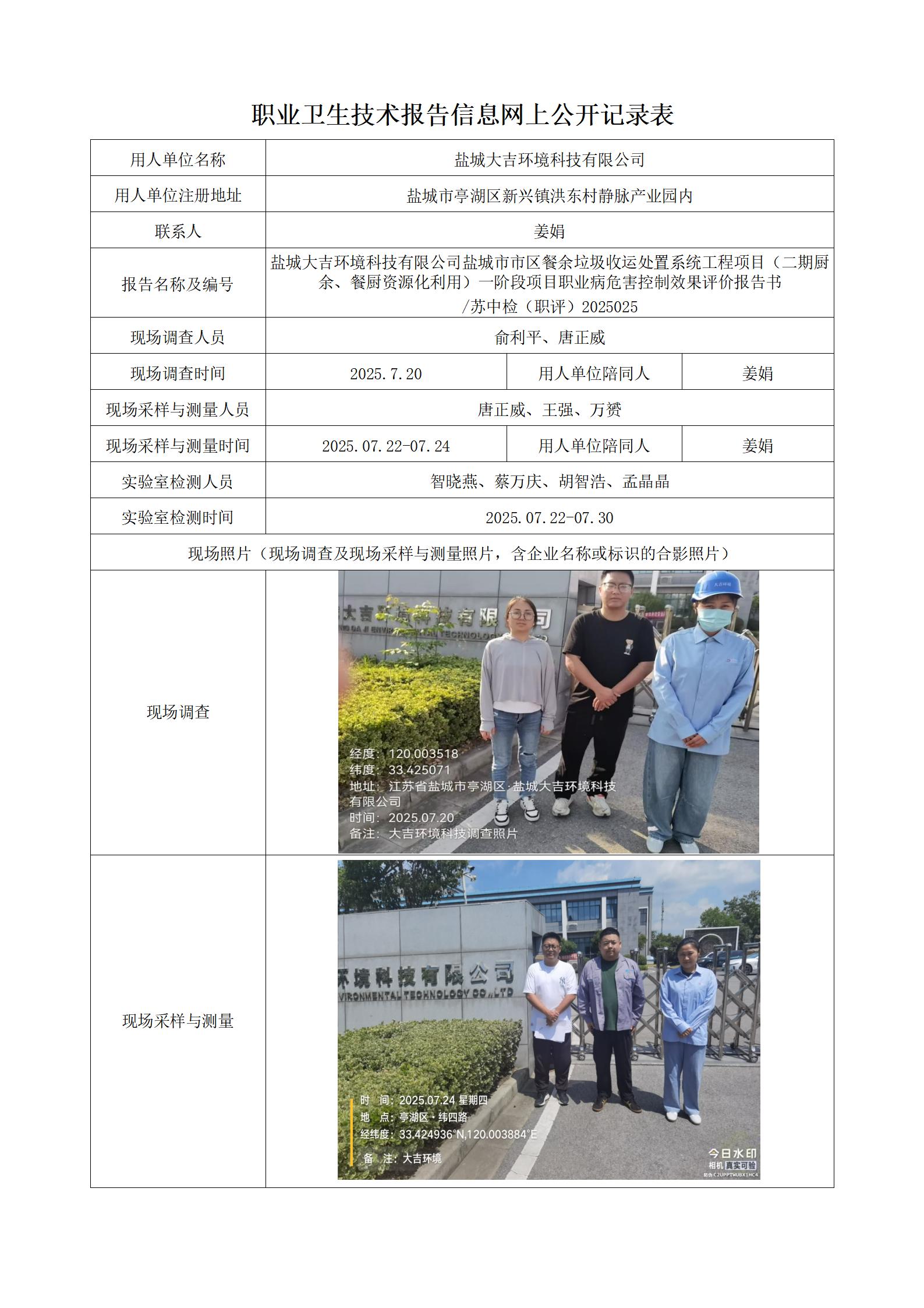 盐城大吉环境科技有限公司职业卫生技术报告信息网上公开记录表