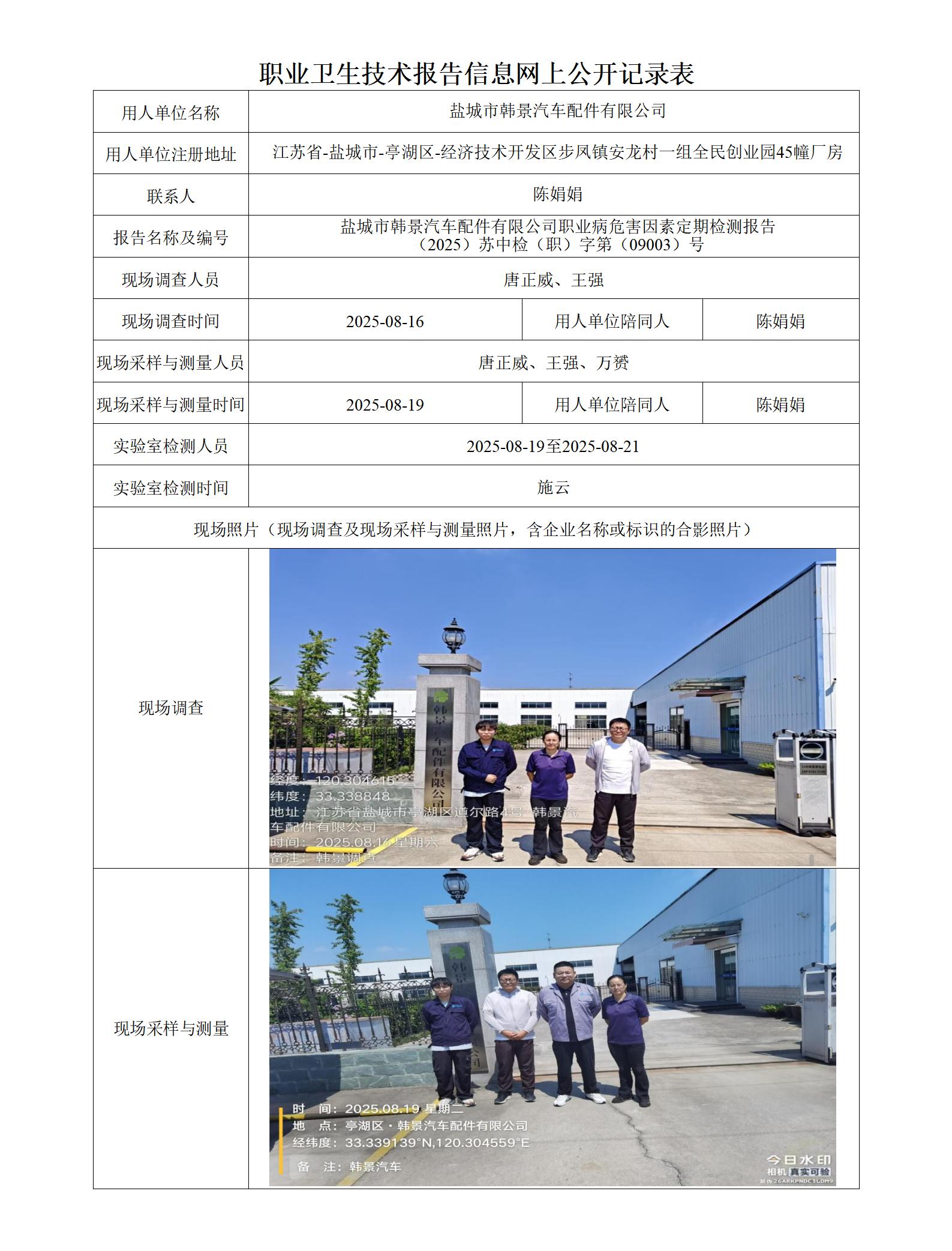 盐城韩景汽车配件有限公司职业卫生技术报告信息网上公开记录表
