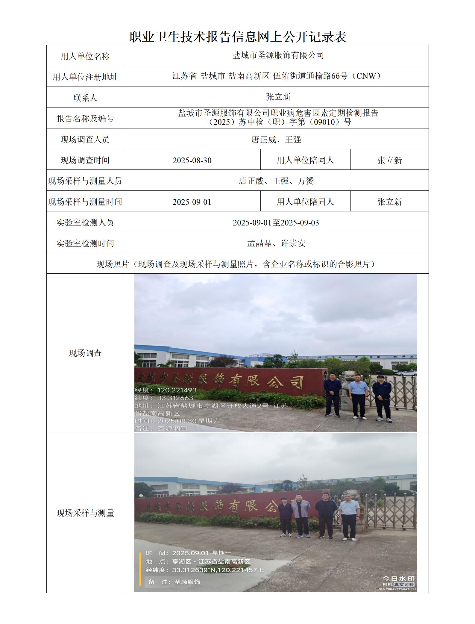 盐城圣源服饰有限公司职业卫生技术报告信息网上公开记录表