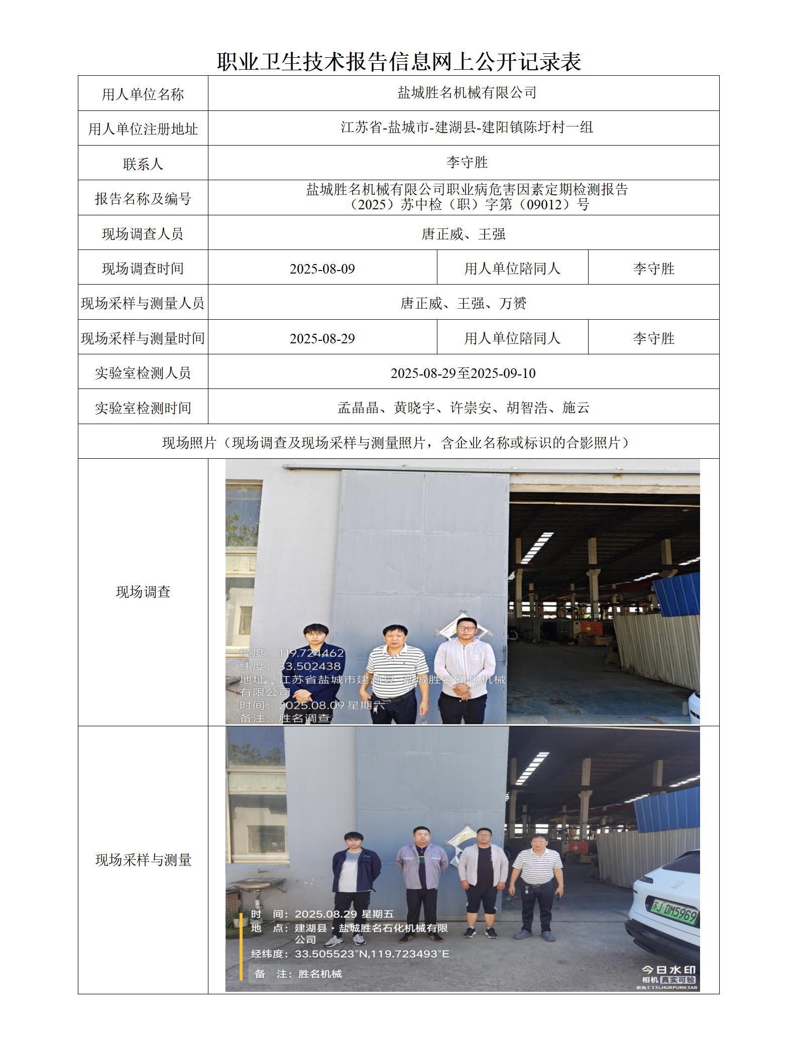 盐城胜名机械有限公司职业卫生技术报告信息网上公开记录表