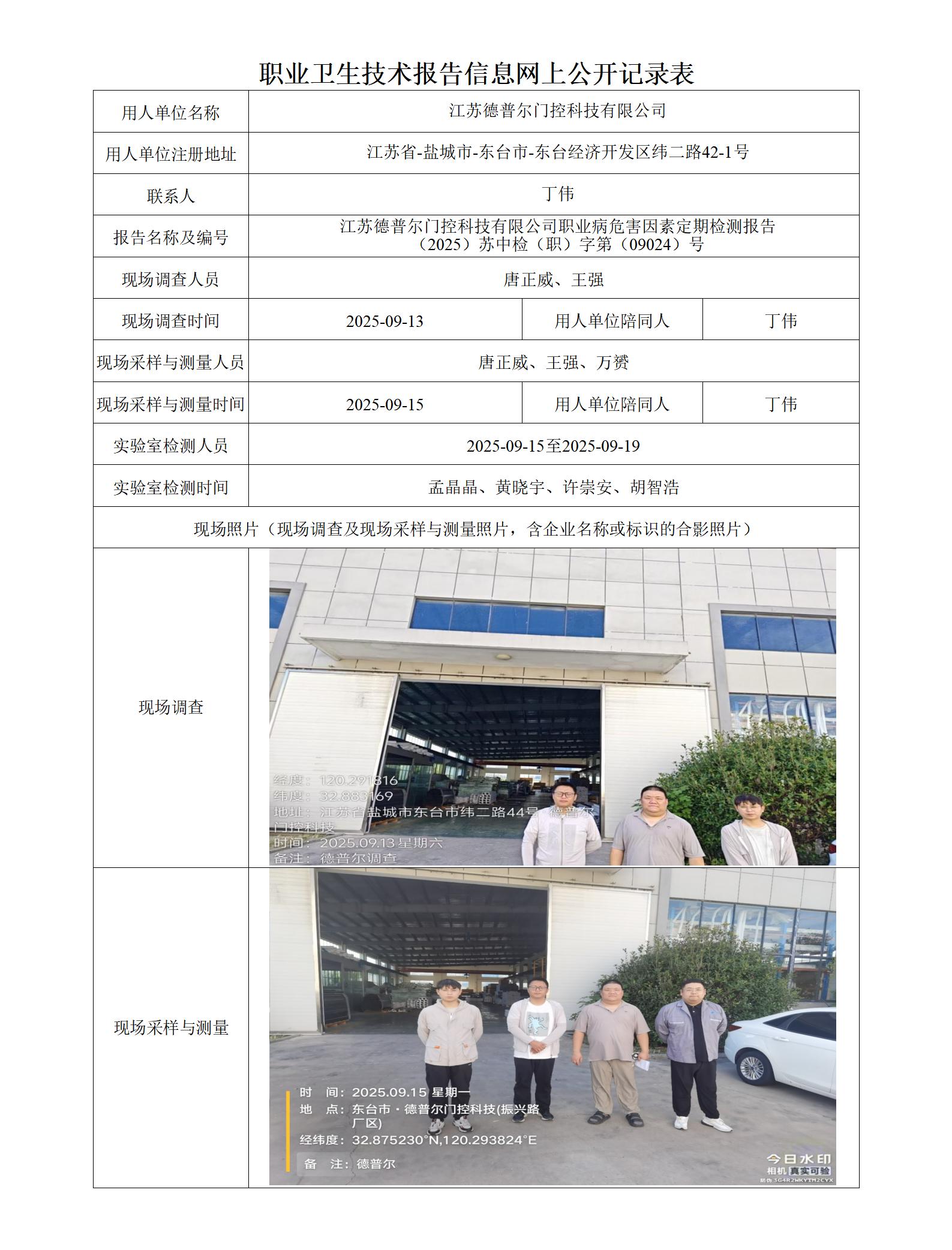 江苏德普尔门控科技有限公司职业卫生技术报告信息网上公开记录表