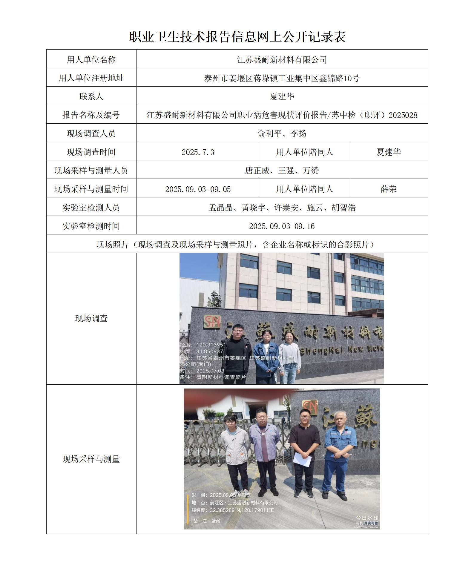 江苏盛耐新材料有限公司职业卫生技术报告信息网上公开记录表