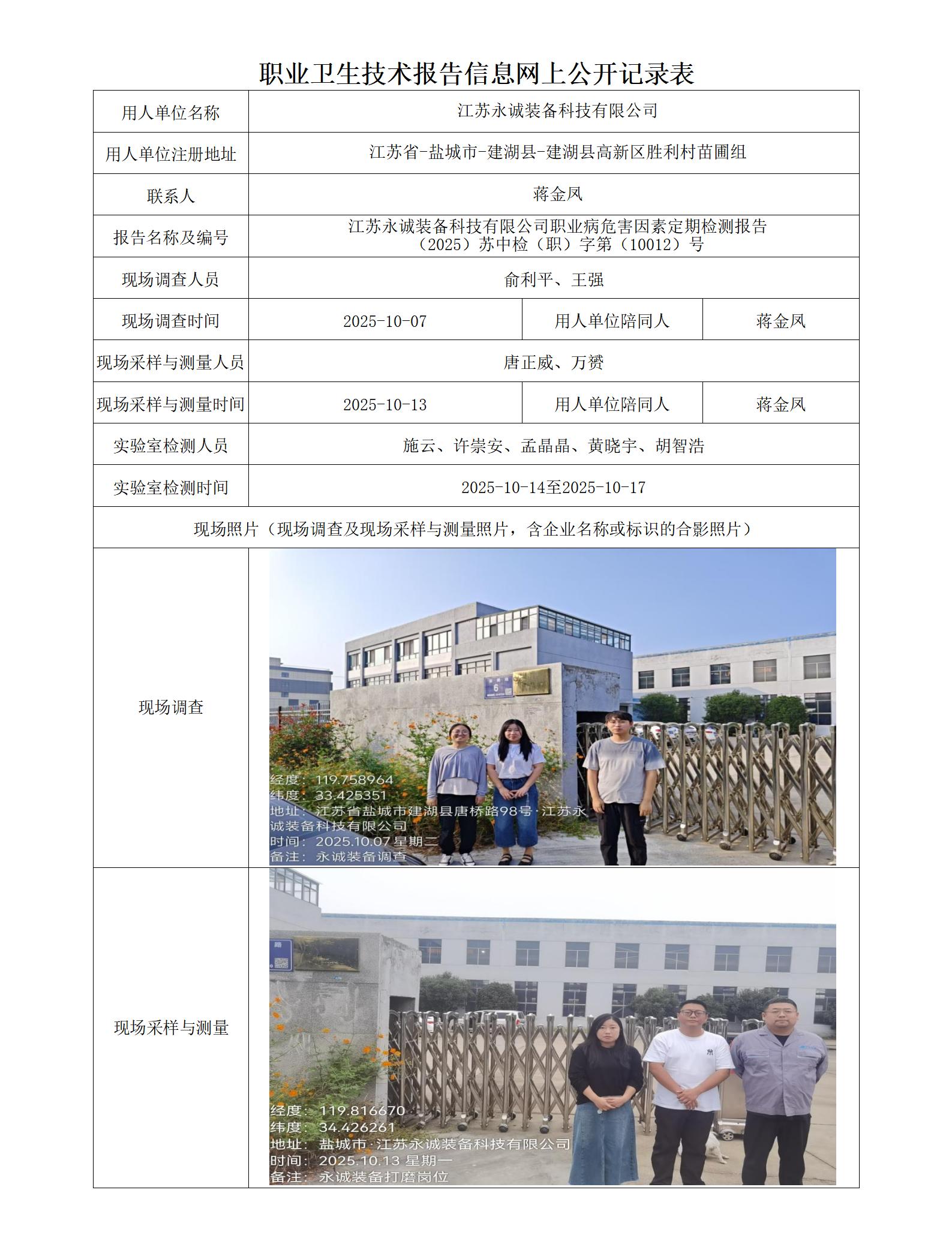 江苏永诚装备科技有限公司职业卫生技术报告信息网上公开记录表