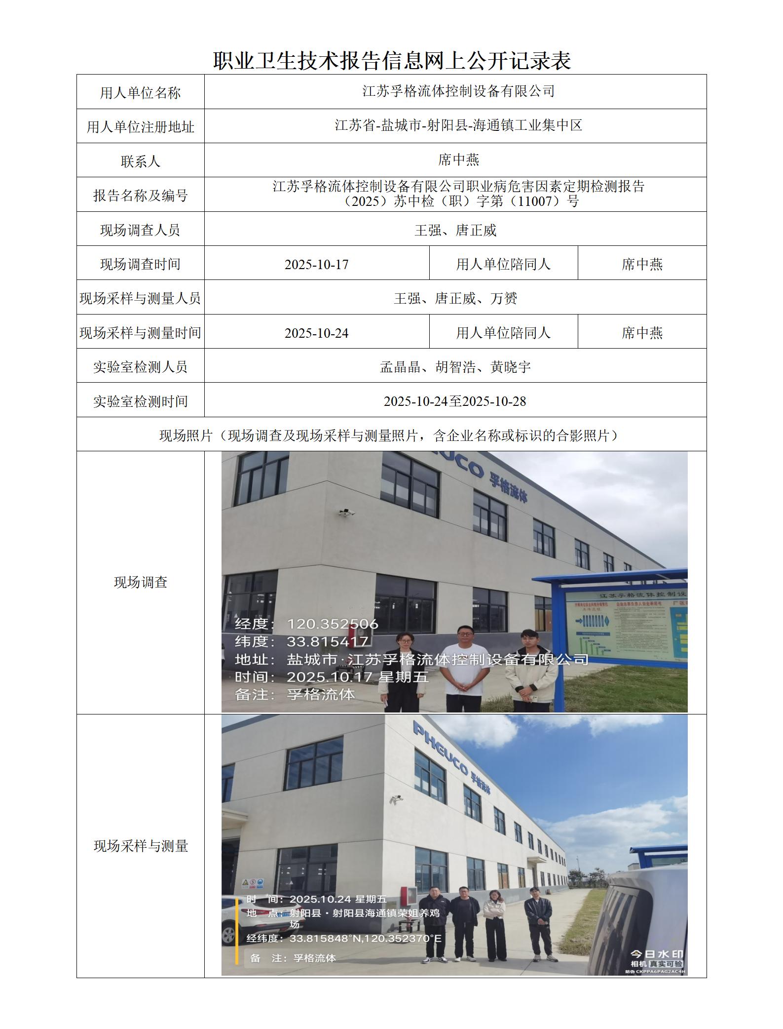 江苏孚格流体控制设备有限公司职业卫生技术报告信息网上公开记录表