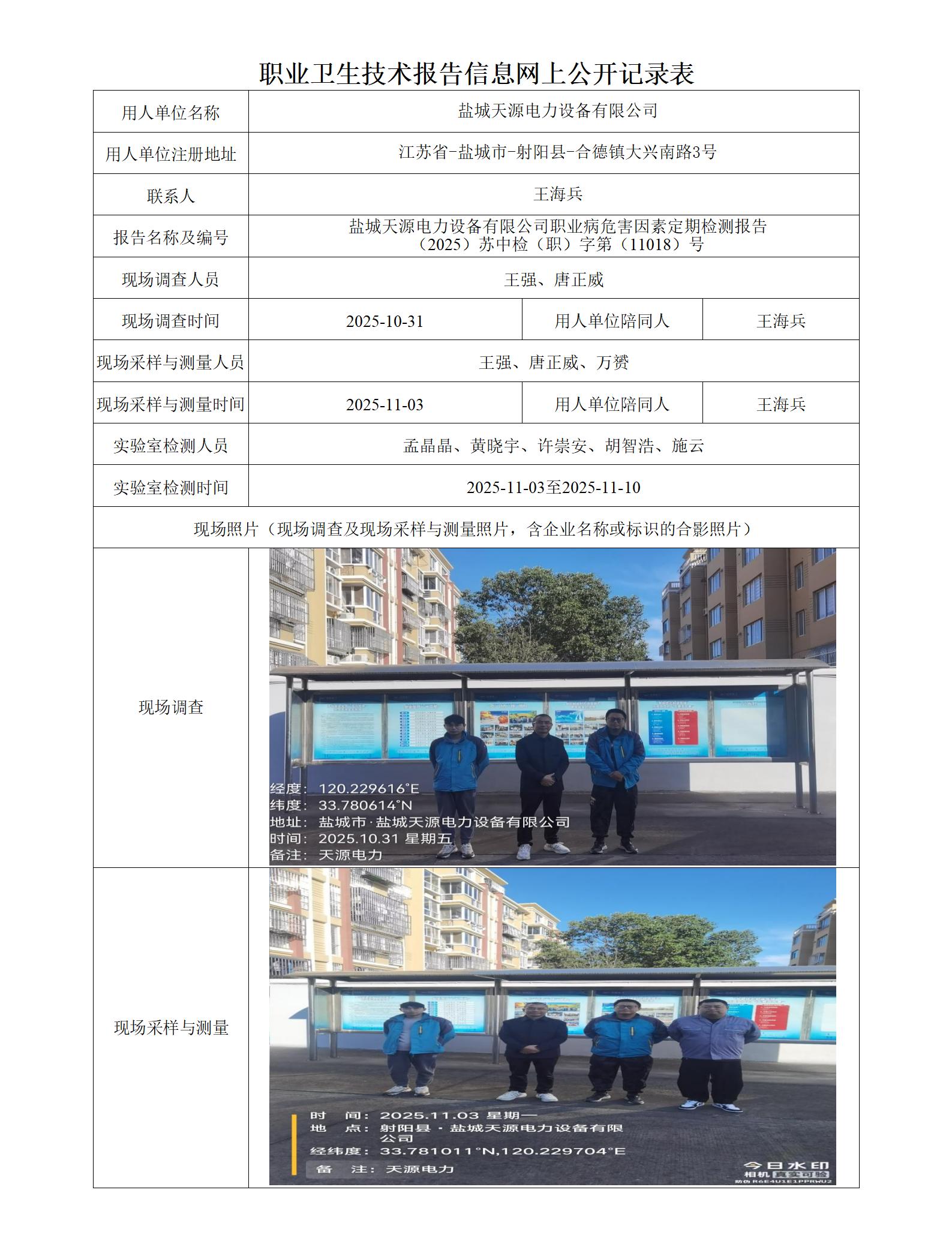 盐城天源电力设备有限公司职业卫生技术报告信息网上公开记录表