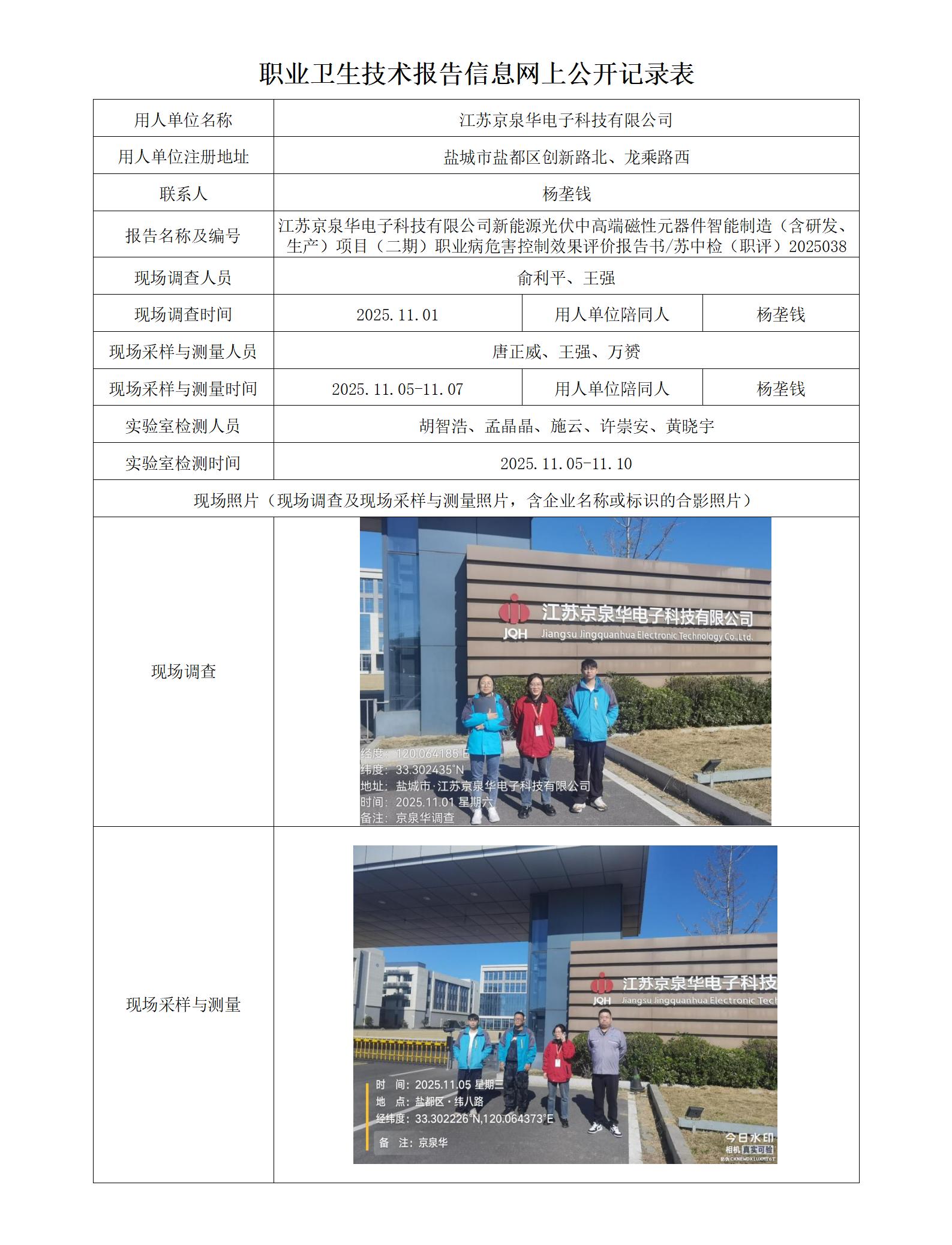 江苏京泉华电子科技有限公司职业卫生技术报告信息网上公开记录表