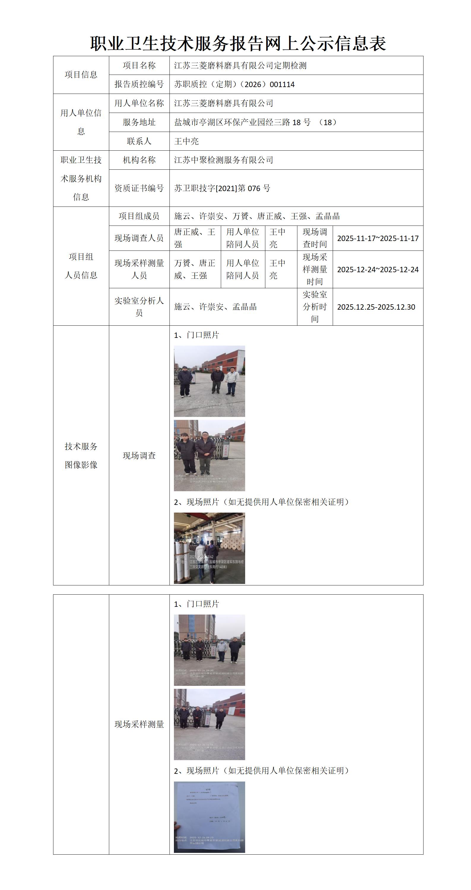 江苏三菱磨料磨具有限公司职业卫生技术服务报告网上公示信息表