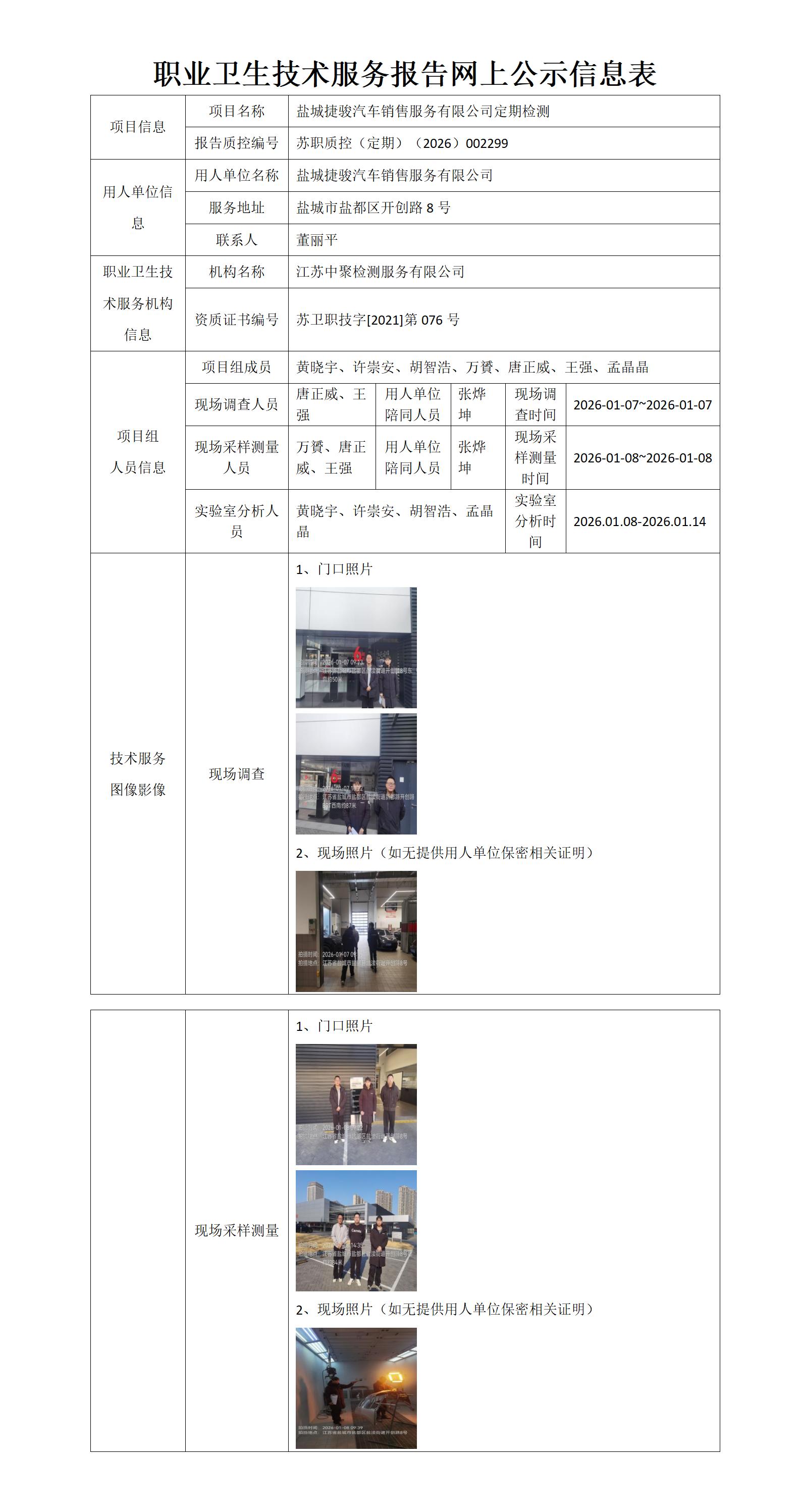 盐城捷骏汽车销售服务有限公司职业卫生技术服务报告网上公示信息表