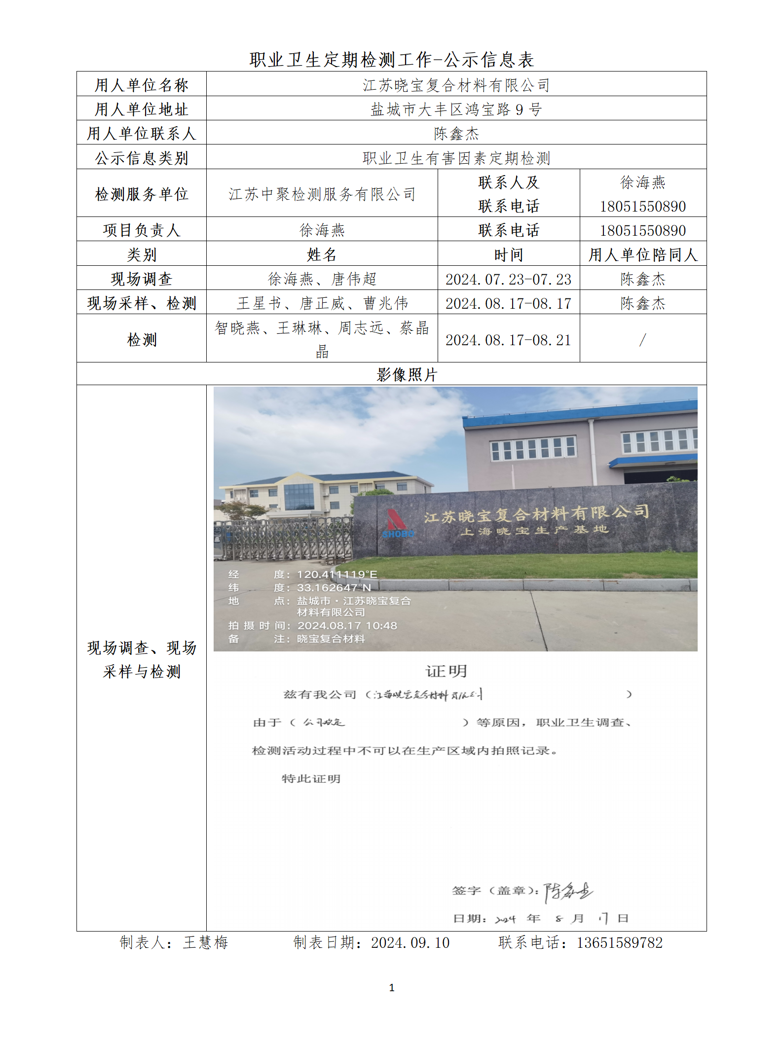 江苏晓宝复合材料有限公司职业卫生定期检测公示表