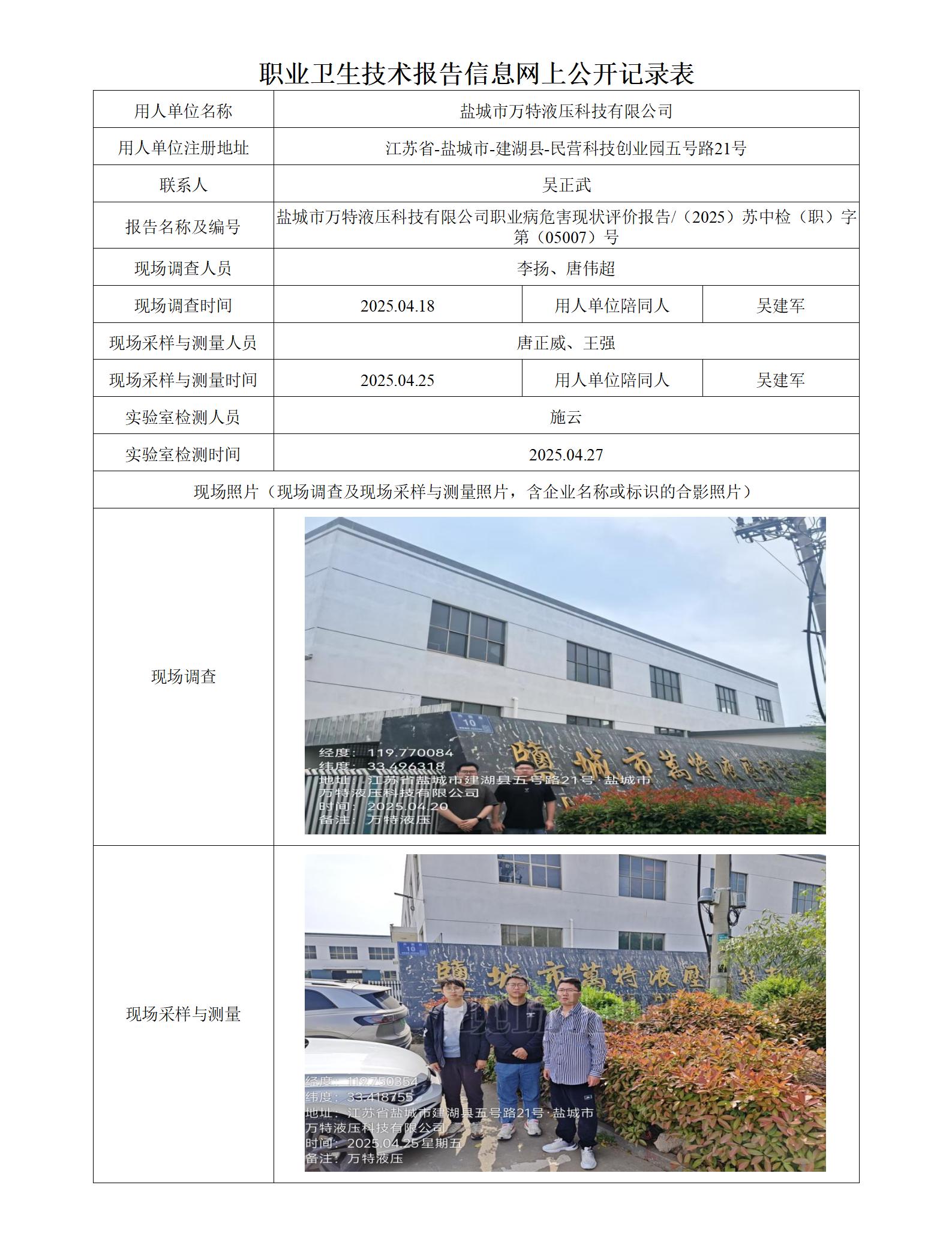 盐城市万特液压科技职业卫生技术报告信息网上公开记录表