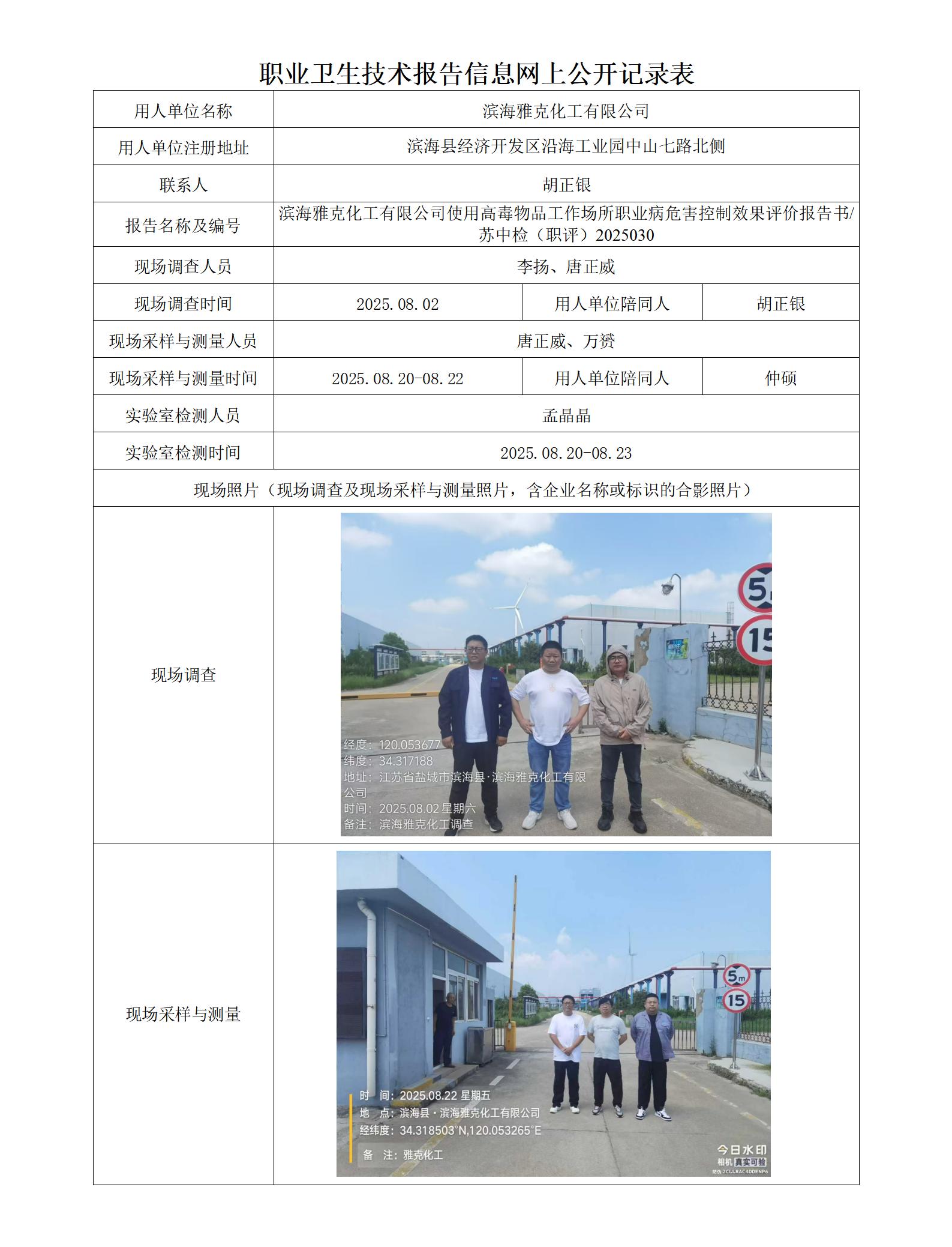 滨海雅克化工有限公司职业卫生技术报告信息网上公开记录表