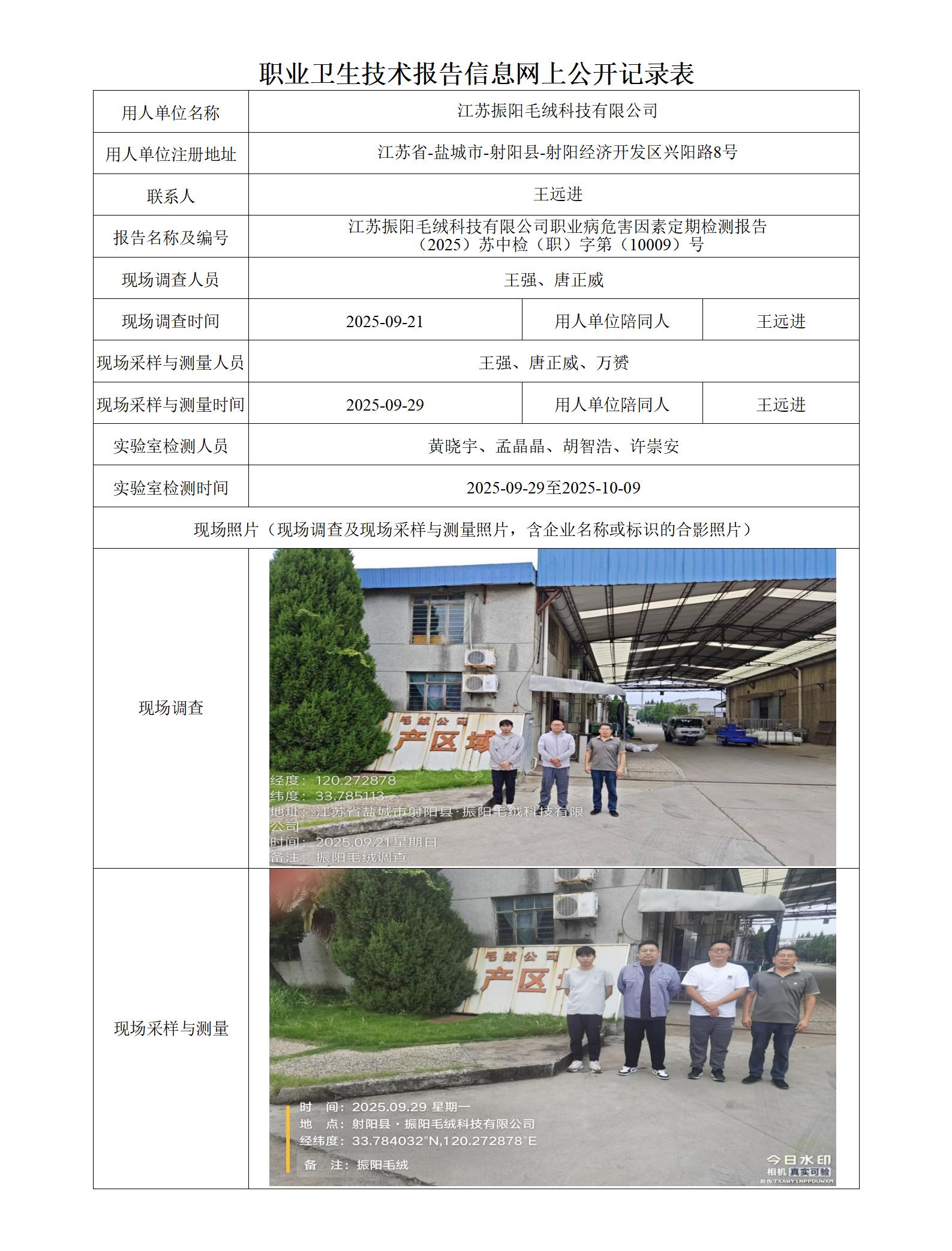 江苏振阳毛绒科技有限公司职业卫生技术报告信息网上公开记录表
