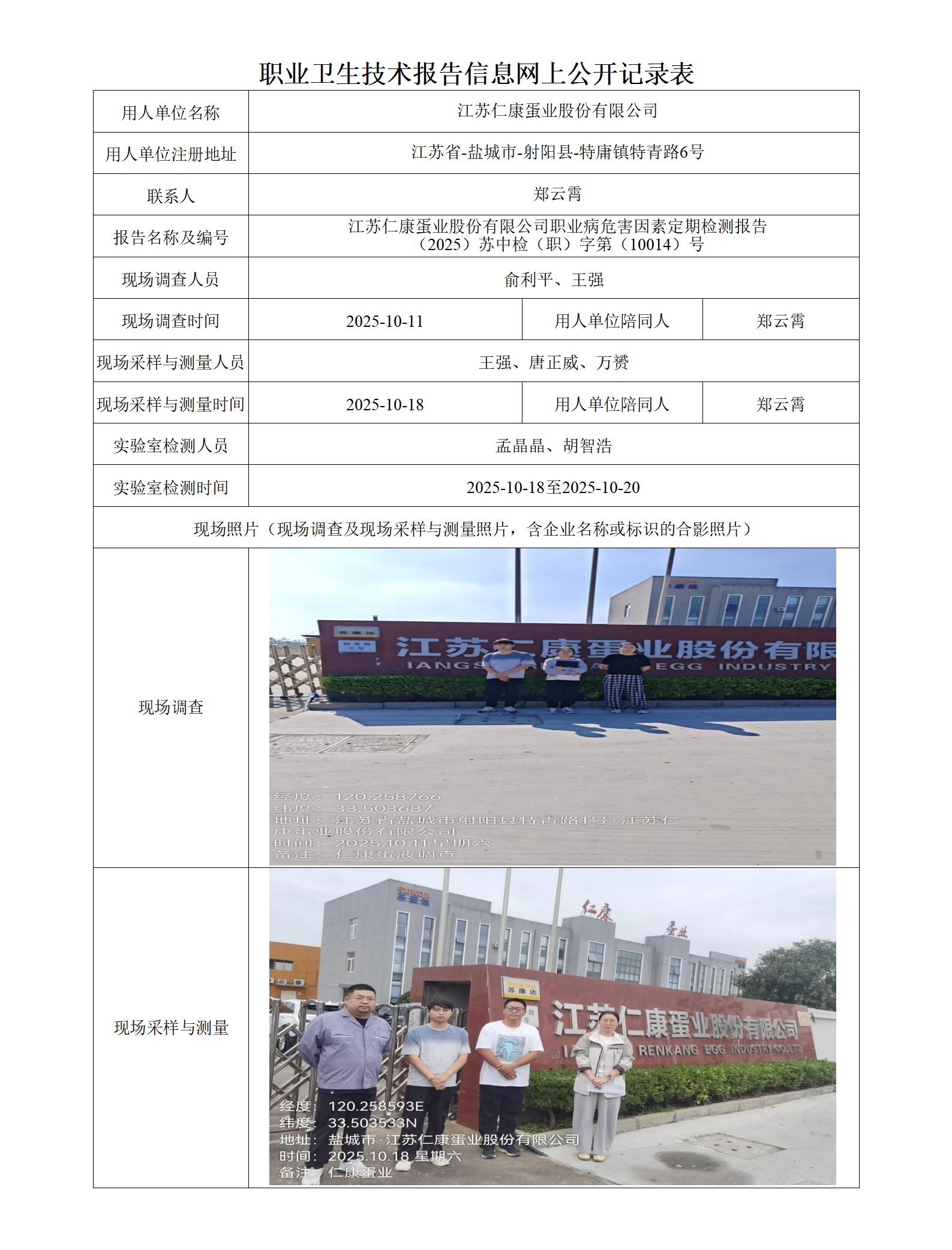 江苏仁康蛋业股份有限公司职业卫生技术报告信息网上公开记录表