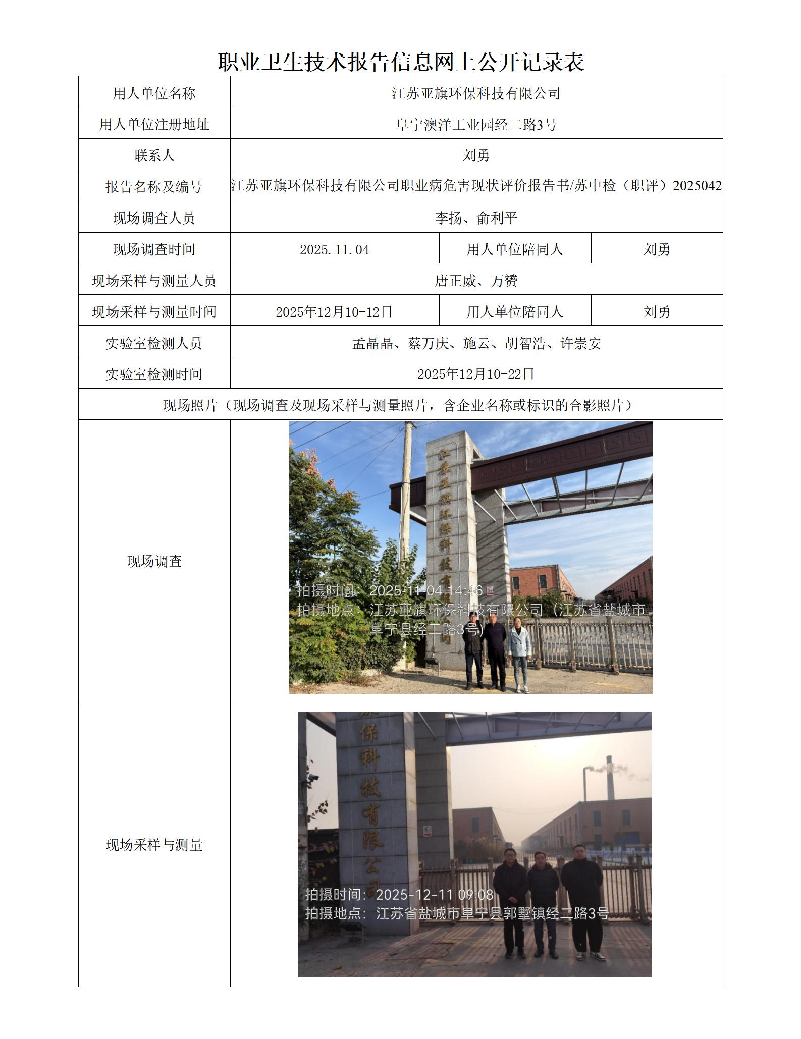 江苏亚旗环保科技有限公司职业卫生技术报告信息网上公开记录表